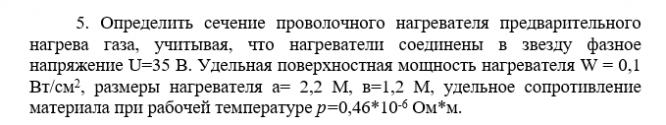 Определить сечение проволочного нагревателя предварительного нагрева газа, учитывая, что нагреватели соединены в звезду фазное напряжение U=35 В. Удельная поверхностная мощность нагревателя W = 0,1 Вт/см2, размеры нагревателя a= 2,2 М, в=1,2 М, удельное сопротивление материала при рабочей температуре р=0,46*10-6 Ом*м.