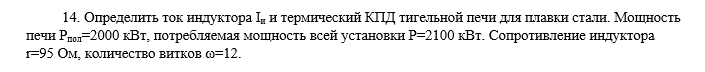 Определить ток индуктора Iи и термический КПД тигельной печи для плавки стали. Мощность печи Рпол=2000 кВт, потребляемая мощность всей установки Р=2100 кВт. Сопротивление индуктора r=95 Ом, количество витков ω=12.