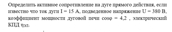 Определить активное сопротивление на дуге прямого действия, если известно что ток дуги I = 15 А, подведенное напряжение U = 380 В, коэффициент мощности дуговой печи cosφ = 4,2 , электрический КПД ηЭЛ.