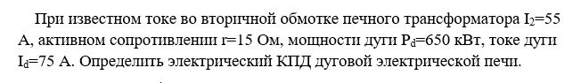 При известном токе во вторичной обмотке печного трансформатора I2=55 А, активном сопротивлении r=15 Ом, мощности дуги Pd=650 кВт, токе дуги Id=75 А. Определить электрический КПД дуговой электрической печи.