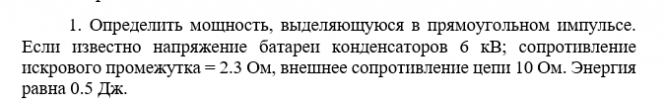 Определить мощность, выделяющуюся в прямоугольном импульсе. Если известно напряжение батареи конденсаторов 6 кВ; сопротивление искрового промежутка = 2.3 Ом, внешнее сопротивление цепи 10 Ом. Энергия равна 0.5 Дж.
