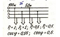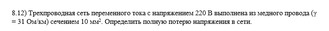 Трехпроводная сеть переменного тока с напряжением 220 В выполнена из медного провода (γ = 31 Ом/км) сечением 10 мм2. Определить полную потерю напряжения в сети.