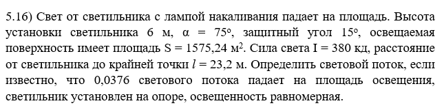 Свет от светильника с лампой накаливания падает на площадь. Высота установки светильника 6 м, α = 75о, защитный угол 15о, освещаемая поверхность имеет площадь S = 1575,24 м2. Сила света I = 380 кд, расстояние от светильника до крайней точки l = 23,2 м. Определить световой поток, если известно, что 0,0376 светового потока падает на площадь освещения, светильник установлен на опоре, освещенность равномерная.