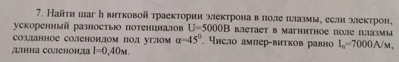 7. Найти шаг h витковой траектории электрона в поле плазмы, если электрон, ускоренный разностью потенциалов U=5000 В влетает в магнитное поле плазмы созданное соленоидом под углом а = 45°. Число ампер-витков равно I = 7000А/м, длина соленоида l = 0,40 м.