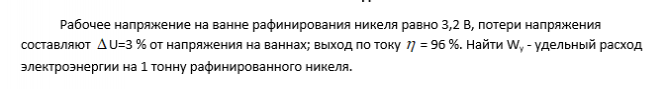 Рабочее напряжение на ванне рафинирования никеля равно 3,2 В, потери напряжения составляют U=3 % от напряжения на ваннах; выход по току 96 %. Найти Wу - удельный расход электроэнергии на 1 тонну рафинированного никеля.