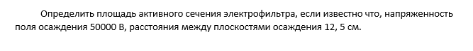Определить площадь активного сечения электрофильтра, если известно что, напряженность поля осаждения 50000 В, расстояния между плоскостями осаждения 12, 5 см.