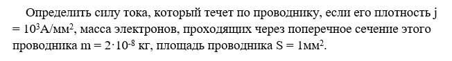 Определить силу тока, который течет по проводнику, если его плотность j = 103 А/мм2, масса электронов, проходящих через поперечное сечение этого проводника m = 2·10-8 кг, площадь проводника S = 1мм2.