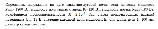 Определить напряжение на дуге ваккумно-дуговой печи, если полезная мощность Pпол.э=1800 Вт, мощность полученная с анода Pа=120 Вт, мощность потерь Pпот.э=180 Вт, коэффициент пропорциональности Ом, сумма приэлектродных падений потенциала Uк.а=13 В, значение катодной доли мощности hк=0,5, длина дуги lд=100 мм, диаметр катода d=20 мм