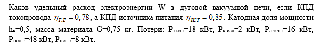 Каков удельный расход электроэнергии W в дуговой вакуумной печи, если КПД токопровода 0,78, а КПД источника питания 0,85. Катодная доля мощности hк=0,5, масса материала G=0,75 кг. Потери: Pа.изл=18 кВт, Pк.изл=2 кВт, Pа.тепл=16 кВт, Pпол.э=48 кВт, Pпот.э=8 кВт.