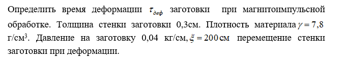 Определить время деформации заготовки при магнитоимпульсной обработке. Толщина стенки заготовки 0,3см. Плотность материала 7,8 г/см3. Давление на заготовку 0,04 кг/см, перемещение стенки заготовки при деформации 200 см.