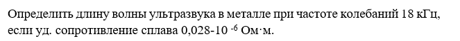 Определить длину волны ультразвука в металле при частоте колебаний 18 кГц, если уд. сопротивление сплава 0,028-10 -6 Ом·м.