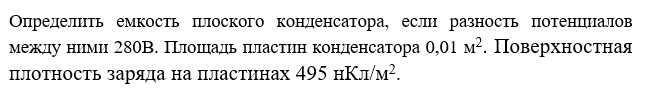 Определить емкость плоского конденсатора, если разность потенциалов между ними 280В. Площадь пластин конденсатора 0,01 м2. Поверхностная плотность заряда на пластинах 495 нКл/м2.