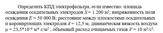 Определить КПД электрофильтра, если известно: площадь осаждения осадительных электродов S = 1 200 м2; напряженность поля осаждения Е = 50 000 В; расстояние между плоскостями осадительных и коронирующих электродов d = 12,5 м; динамическая вязкость воздуха μ = 23,5*10−6 м* с/м2 ; объемный расход очищаемых газов V = 10 м33
