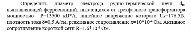 Определить диаметр электрода рудно-термической печи dp, выплавляющей ферросилиций, питающихся от трехфазного трансформатора мощностью Р=13500 кВ*А, линейное напряжение которого Uл=176,5В, плотность тока δ=0,5 А/см, реактивное сопротивление х=10*10-4 Ом. Активное сопротивление короткой сети R=1,6*10-4 Ом.