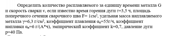 Определить количество расплавляемого за единицу времени металла G и скорость сварки v, если известно время горения дуги τ=3,5 ч, площадь поперечного сечения сварочного шва F= 1см2, удельная масса наплавляемого металла γ=6,3 г/см3, коэффициент плавления αп=55г/ч, коэффициент наплавки αн=6 г/(А*ч), эмпирический коэффициент k=0,7, давление дуги p=40 Па.