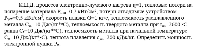 К.П.Д. процесса электронно-лучевого нагрева ղ=1, тепловые потери на испарение материала Рисп=0,7 кВт/см2, потери отводимые устройством Руст=0,5 кВт/см2, скорость плавки G=1 кг/с, теплоемкость расплавленного металла Сж=10 Дж/(кг*оС), теплоемкость твердого металла при tпл=2600 оС равна Сt=10 Дж/(кг*оС), теплоемкость металла при начальной температуре Со=10 Дж/(кг*оС), теплота плавления qпл=200 кДж/кг. Определить мощность электронной пушки Рп.