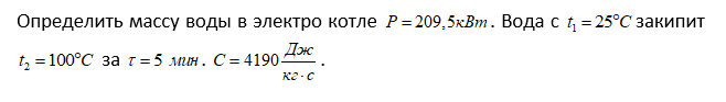Определить массу воды в электрокотле Р = 209,5 кВт. Вода с 25 градусов закипит при 100 градусах за 5 мин.