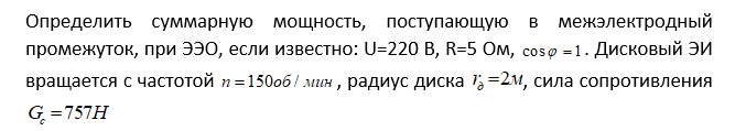 Определить суммарную мощность, поступающую в межэлектродный промежуток, при ЭЭО, если известно: U=220 В, R=5 Ом. Дисковый ЭИ вращается с частотой, радиус диска, сила сопротивления.