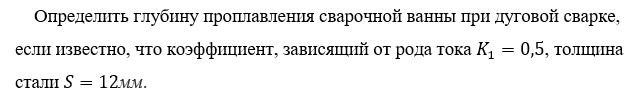 Определить глубину проплавления сварочной ванны при дуговой сварке, если известно, что коэффициент, зависящий от рода тока, толщина стали.