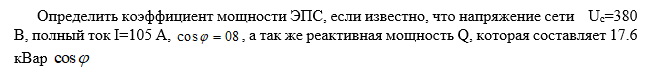 Определить коэффициент мощности ЭПС, если известно, что напряжение сети Uc=380 В, полный ток I=105 А, а так же реактивная мощность Q, которая составляет 17.6 кВар