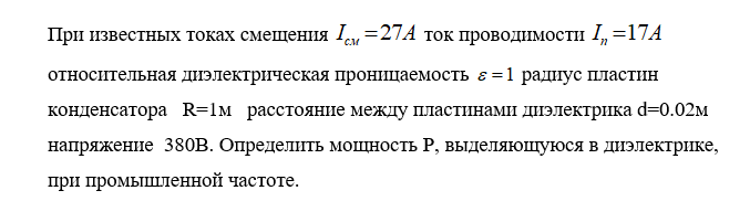 При известных токах смещения, ток проводимости, относительная диэлектрическая проницаемость, радиус пластин конденсатора R=1м расстояние между пластинами диэлектрика d=0.02м напряжение 380В. Определить мощность Р, выделяющуюся в диэлектрике, при промышленной частоте.