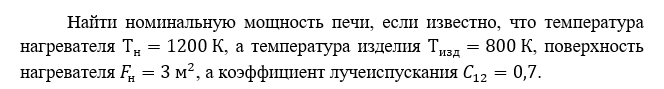 Найти номинальную мощность печи, если известно, что температура нагревателя , а температура изделия , поверхность нагревателя , а коэффициент лучеиспускания .