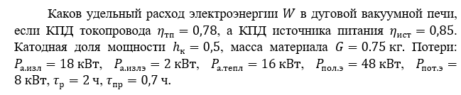 Каков удельный расход электроэнергии в дуговой вакуумной печи, если КПД токопровода, а КПД источника питания. Катодная доля мощности, масса материала.