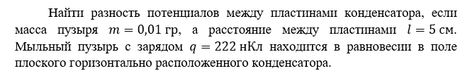 Найти разность потенциалов между пластинами конденсатора, если масса пузыря , а расстояние между пластинами . Мыльный пузырь с зарядом находится в равновесии в поле плоского горизонтально расположенного конденсатора.