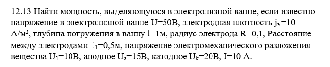 Найти мощность, выделяющуюся в электролизной ванне, если известно напряжение в электролизной ванне U = 50 В, электродная плотность jэ = 10 A/м2, глубина погружения в ванну l = 1м, радиус электрода R = 0,1, Расстояние между электродами l1 = 0,5м, напряжение электромеханического разложения вещества U1 = 10В, анодное Ua = 15В, катодное Uk = 20В, I = 10 А.