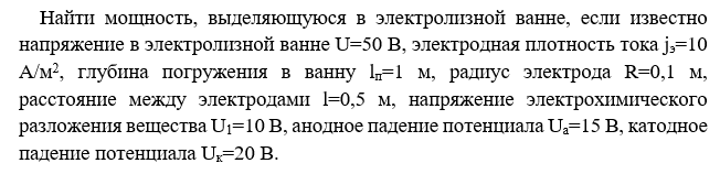 Найти мощность, выделяющуюся в электролизной ванне, если известно напряжение в электролизной ванне U=50 В, электродная плотность тока jэ=10 А/м2, глубина погружения в ванну lп=1 м, радиус электрода R=0,1 м, расстояние между электродами l=0,5 м, напряжение электрохимического разложения вещества U1=10 В, анодное падение потенциала Uа=15 В, катодное падение потенциала Uк=20 В.