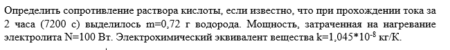 Определить сопротивление раствора кислоты, если известно, что при прохождении тока за 2 часа (7200 с) выделилось m=0,72 г водорода. Мощность, затраченная на нагревание электролита N=100 Вт. Электрохимический эквивалент вещества k=1,045*10-8 кг/К