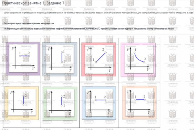 Закон сохранения и превращения энергии, распространенный на тепловые явления, называется первым законом (началом) термодинамики.Для изопроцессов данный закон можно отобразить в виде графиков. Рассмотрите представленные графики изопроцессов. Выберите один или несколько правильных вариантов графического отображения ИЗОБАРИЧЕСКОГО процесса, наведя на него курсор и нажав левую кнопку компьютерной мыши..