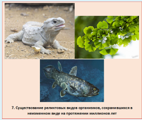 К критериям биологического прогресса относят увеличение численности особей и числа таксонов (популяций, подвидов, видов и т. д.); расширение ареала. Эволюционное изменение, ведущее к усложнению строения и функций организмов, повышающее общий уровень их организации, позволяющее освоить новую среду обитания — идиоадаптация. Развитие маскирующей окраски у тигров – это пример идиоадаптации. Редукция пищеварительной системы у бычьего цепня – это пример дегенерации. Примером ароморфоза является появление копыт у лошадей. Возникновение четырехкамерного сердца у птиц является результатом ароморфоза. В состоянии регресса в настоящее время находятся многие сорняки (одуванчик, пырей, марь белая)..