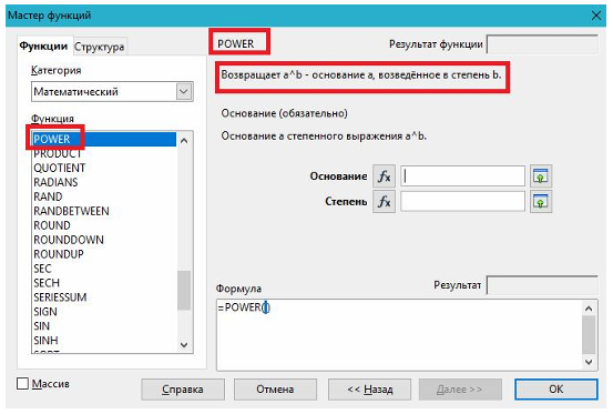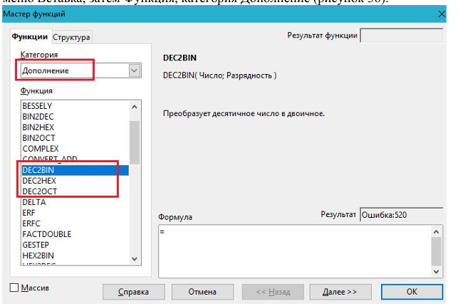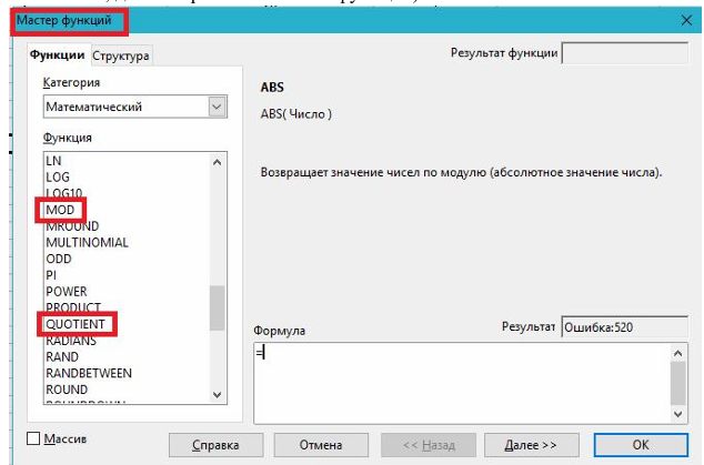 В электронной таблице OpenOffice.org.Calc для получения целой части числа при делении используется функция QUOTIENT. Функция QUOTIENT имеет синтаксис: =QUOTIENT(Числитель; Знаменатель), где Числитель – любое десятичное число, Знаменатель – основание системы счисления. Для получения целочисленного остатка от деления используется функция MOD. Функция MOD имеет синтаксис: =MOD (Числитель; Знаменатель), где Числитель – любое десятичное число, Знаменатель – основание системы счисления. Указанные функции вызываются так: команда главного меню Вставка, действие Функция. В открывшемся окне Мастер функций выбирают категорию Математические, а затем выбирают необходимые функции (рисунок 2).