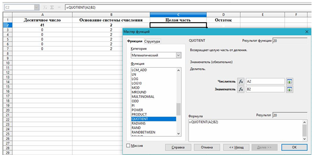 Функция QUOTIENT имеет синтаксис: =QUOTIENT(Числитель; Знаменатель), где Числитель – любое десятичное число, Знаменатель – основание системы счисления.