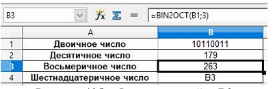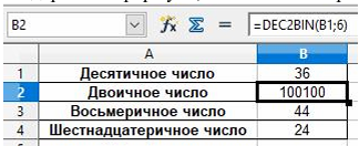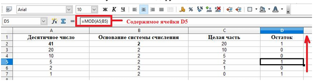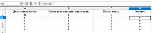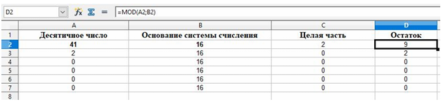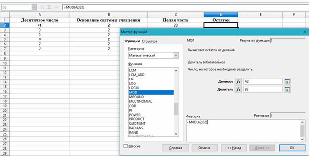 Функция MOD имеет синтаксис: =MOD (Числитель; Знаменатель), где Числитель – любое десятичное число, Знаменатель – основание системы счисления.