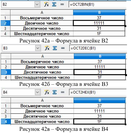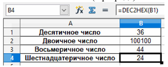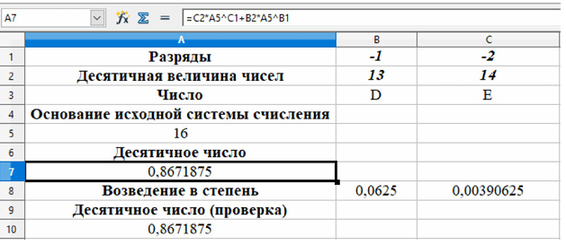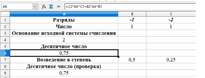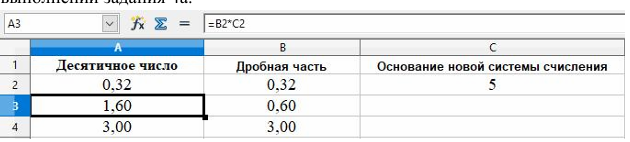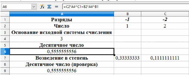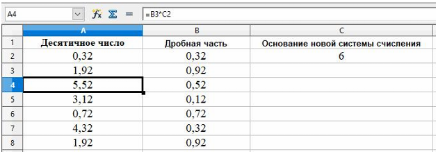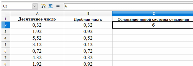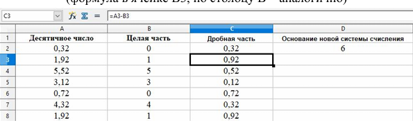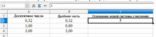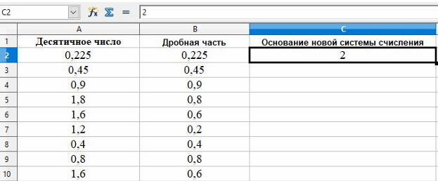Ячейка С2 содержит основание новой системы счисления, то есть основание той системы счисления, в которую переводится заданное число (заданная дробная часть десятичного числа).