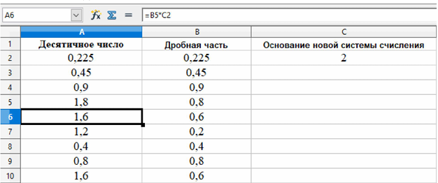 если при умножении в дробной части числа нули не образуются, необходимо вести умножение до получения дробной части с некоторой (заданной) степенью точности. Например, при переводе дробной части числа (0,8125) из десятичной системы счисления в двоичную, получим (рисунок 10): Тогда, (0,8125)10 = (0,1101)2 . В электронной таблице OpenOffice.org.Calc для перевода дробной части десятичного числа в число, записанное в системе счисления с произвольным основанием имеется ряд функций, о которых будет рассказано ниже. Используя выше представленный алгоритм, перевод целесообразно выполнить с применением достаточно простых и понятных формул. Задание 3. Перевести десятичное число 0, 225 в двоичную систему счисления (ответ округлить до восьмого знака после запятой).