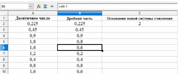 Столбец А (Десятичное число) содержит результат умножения дробной части числа на число 2 (основание новой системы счисления).