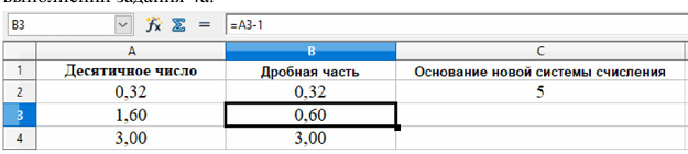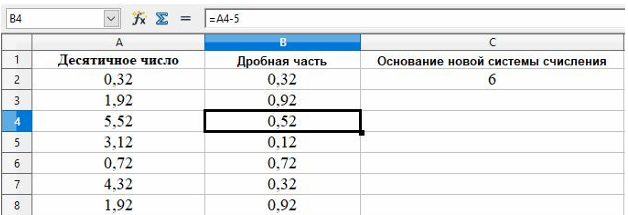 Столбец В (Дробная часть) содержит только дробную часть десятичного числа из соответствующих ячеек столбца А (если число, содержащееся в ячейках столбца А, содержит целую часть, которая при переводе в пятеричную систему всегда не больше 5, то эта целая часть, вычитается).