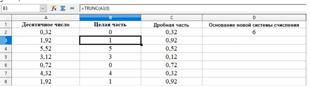 Столбец А (Десятичное число) содержит результат умножения дробной части числа на число 6 (основание новой системы счисления).