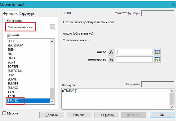 Примечание 1: Для формирования целой части числа можно использовать функцию TRUNC из категории функций Математический Функция TRUNC имеет следующий синтаксис: = TRUNC (Число; Количество), где Число – усекаемое число, то есть число, для которого формируется целая часть; Количество – количество символов, которые тр....
