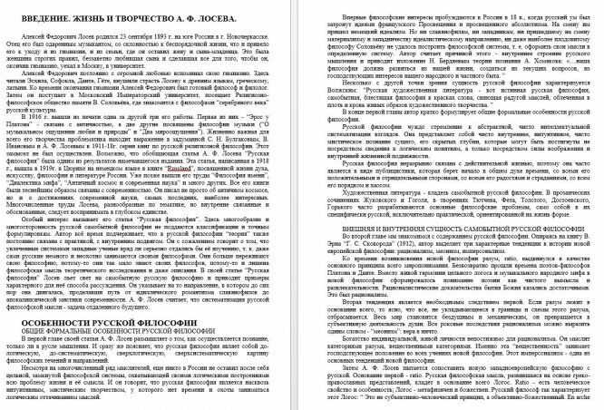 Особый интерес вызывает его статья “Русская философия”. Здесь многообразие и многосторонность русской самобытной философии не поддаются классификации и точным формулировкам. Автор всё время подчеркивает, что в русской философии “теория” также постоянно связана с практикой, с внутренним подвигом. Он с сожалением говорит о том, что увлеченные системами западные ученые вряд ли серьезно отдались бы её изучению, т. к. даже сами русские немного и неохотно занимаются своими философами. Они больше переживают свою философию, потому-то они так мало знают своих философов, потому-то и лишена философская мысль теоретического исследования и даже описания. В своей статье “Русская философия” Лосев льет свет на самобытную русскую философию и приводит примеры характерного для неё способа рассуждения. Он указывает на то направление, в котором до сих пор она двигалась, проделавши путь от идиллического романтизма славянофилов до апокалипсической мистики современности. А. Ф. Ло