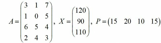 Предприятие производит 3 типа продукции, используя 4 вида ресурсов. Нормы затрат ресурса i-го товара на производство единицы продукции j-го типа заданы матрицей затрат A. Пусть за определенный промежуток времени предприятие выпустило количество продукции каждого типа xij, записанное матрицей X. Пусть стоимость каждого вида ресурсов в расчете на единицу задана матрицей P.