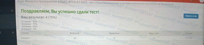 Для студентов ИДДО НИУ «МЭИ» по предмету Финансы предприятияКМ-2. Управление денежными средствами и дебиторской задолженностью. Тестирование - 75%КМ-2. Управление денежными средствами и дебиторской задолженностью. Тестирование - 75%