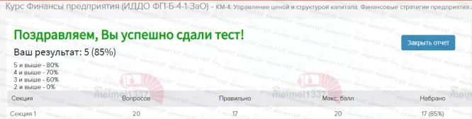Для студентов ИДДО НИУ «МЭИ» по предмету Финансы предприятияПомощь со сдачей - КМ-4. Управление ценой и структурой капитала. Финансовые стратегии предприятия. ТестированиеПомощь со сдачей - КМ-4. Управление ценой и структурой капитала. Финансовые стратегии предприятия. Тестирование