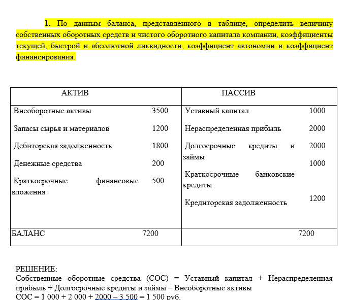 1 По данным баланса, представленного в таблице, определить величину собственных оборотных средств и чистого оборотного капитала компании, коэффициенты текущей, быстрой и абсолютной ликвидности, коэффициент автономии и коэффициент финансирования.