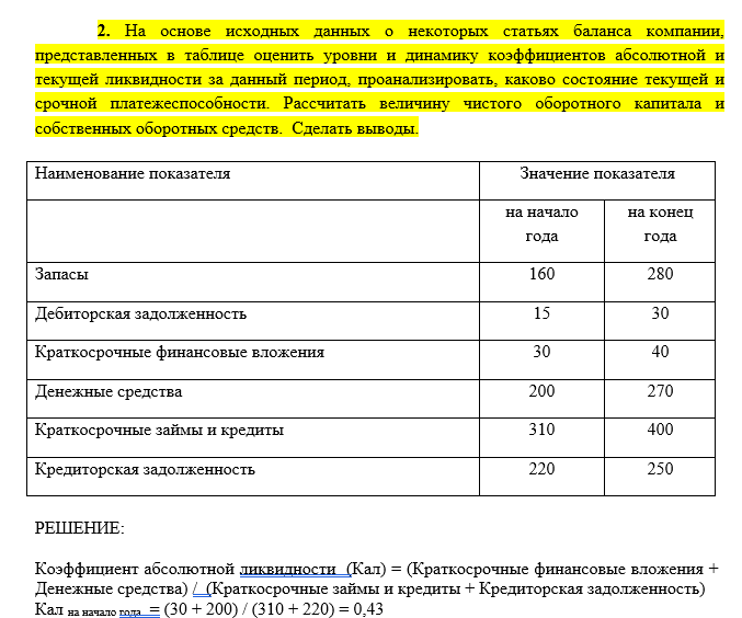 2 На основе исходных данных о некоторых статьях баланса компании, представленных в таблице оценить уровни и динамику коэффициентов абсолютной и текущей ликвидности за данный период, проанализировать, каково состояние текущей и срочной платежеспособности. Рассчитать величину чистого оборотного капитала и собственных оборотных средств. Сделать выводы.