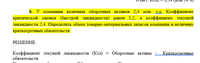 6. У компании величина оборотных активов 2,4 млн. у.е. Коэффициент критической оценки (быстрой ликвидности) равен 1,2, а коэффициент текущей ликвидности 2,4. Определить объем товарно-материальных запасов компании и величину краткосрочных обязательств.