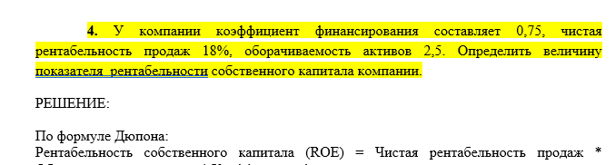 4. У компании коэффициент финансирования составляет 0,75, чистая рентабельность продаж 18%, оборачиваемость активов 2,5. Определить величину показателя рентабельности собственного капитала компании.